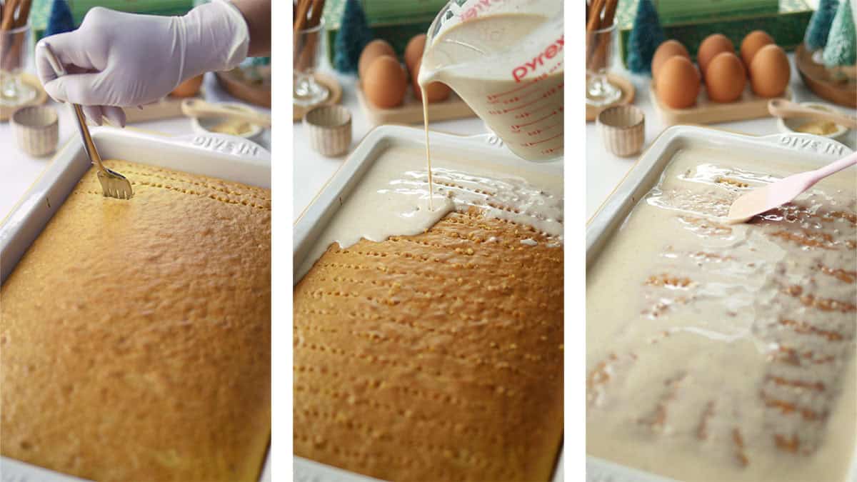 - Once the cake has completely cooled, use a fork to poke holes into the cake in evenly spaced rows about half inch apart.