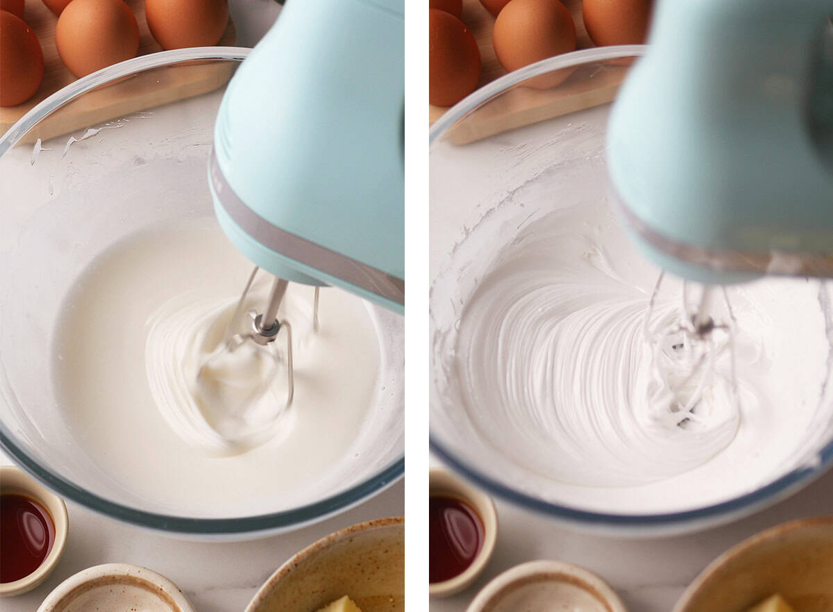 Whip the mixture in a counter mixer with the balloon whisk attached. Whip on low to start, then increase to medium. Once the mixture is stiff and the bottom of the bowl is cool to the touch, stop mixer. This can take up to 30 minutes. TIP: Test the mixture with an instant read thermometer, it should be between 70-75F.